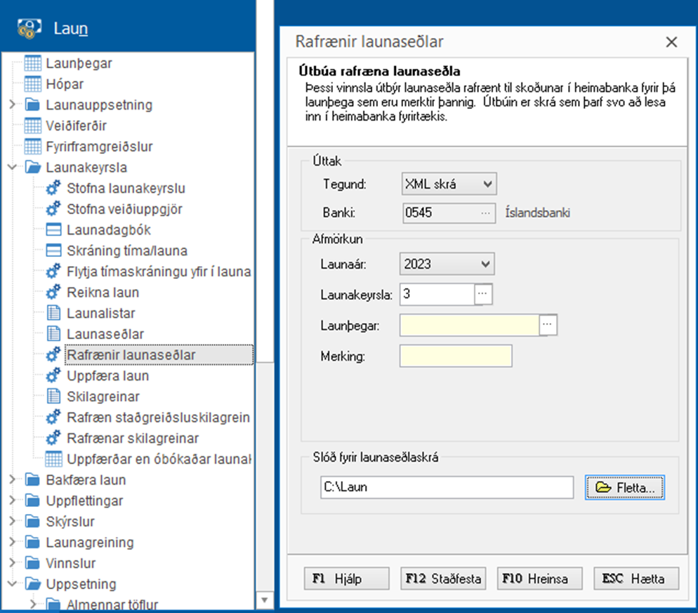XML skrá og velja síðan réttan banka, launaár, launakeyrslu