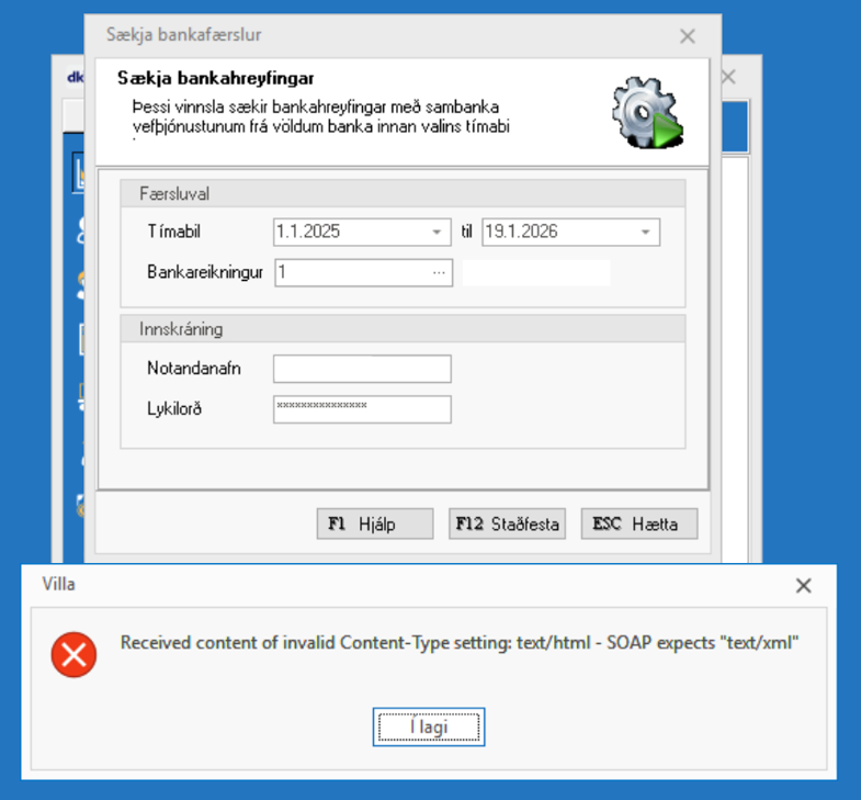 Ef villan "Content-Type setting: text/html - SOAP expects "text/xml" " kemur upp þegar veirð er að sækja bankahreyfingar þá er eitthvað ekki rétt í samskiptum við bankann.