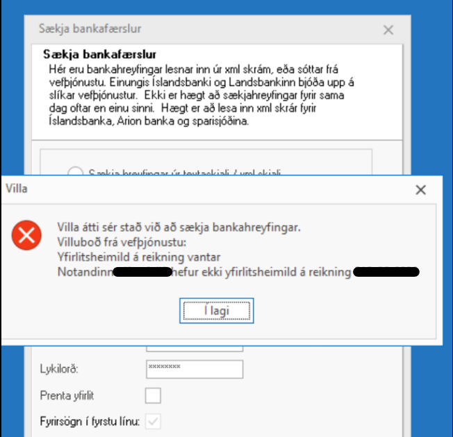 Ef eftirfarandi villumelding kemur upp við innlestur bankahreyfinga þá þarf að hafa samband við bankann og láta opna fyrir að notandinn geti sótt bankahreyfingar.