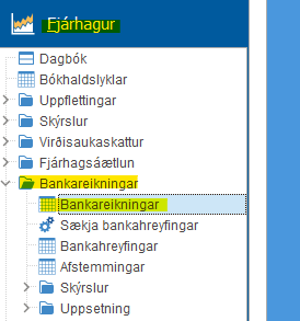 Skoða þarf því uppsetningu bankareikningsins undir Fjárhagur > Bankareikningar > Bankareikningar.