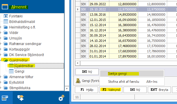 Gjaldmiðlar - Gengi = 1 Ef gengi eða gjaldmiðill skilar sér ekki rétt á bókhaldslykil/lánardrottin/skuldunaut er byrjað á að skoða stillingar. Stillingar eru eftirfarandi: Fjárhagur - safnlyklar (7622, 9322) Banki/Erlend lán ...