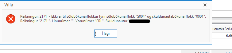 Ef þið fáið sambærilega villu þegar er verið að bóka reikninga eða söludagbók þá þarf að stofna nýjan sölubókunarflokk og tengja við bókunarfl. skuldunauta.