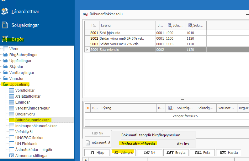 Stofna vöru - Villa vegna sölubókunarflokks Ef þið fáið sambærilega villu þegar er verið að stofna vöru þá þarf að setja inn bókhaldslykil fyrir sölutekjur án vsk á sölubókunarflokk. Birgðir > Uppsetning > Sölubókunarflokkar > Opnar bókunarflokka sem ...