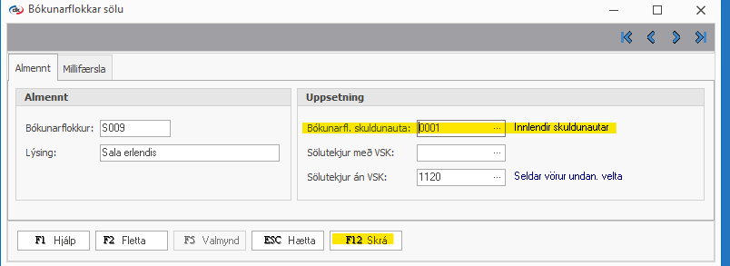 Setur síðan inn Bókunarfl.skuldunauta sem sýnir á villunni og F12 skrá.