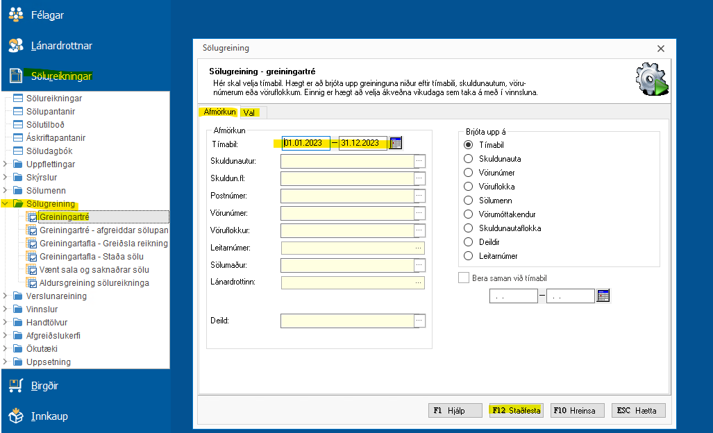 Fylla inn undir "Afmörkun" og "Val" það sem leitað er eftir > F12 Staðfesta