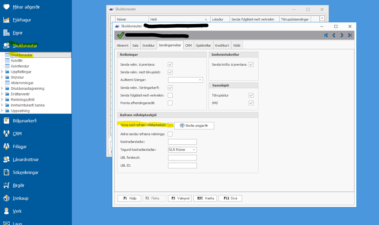 Undir Skuldnautar - skuldnautar - tvísmella á skuldnautinn, svo undir "sendingarmátar" - haka í "vinna með rafræn viðskiptaskjöl"