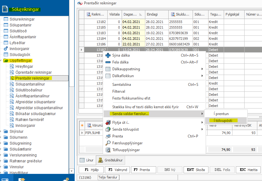 Til að senda sölureikninga sem frumrit þá er farið í Sölureikningar > Uppflettingar > Prentaðir reikningar > Hægri smellir á reikninginn sem á að senda > Senda valdar færslur.. > Í tölvupósti