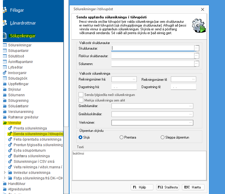 Næst er að senda sölureikninga í tölvupósti með því að fara í Sölureikningar > Vinnslur > Senda sölureikninga í tölvupósti