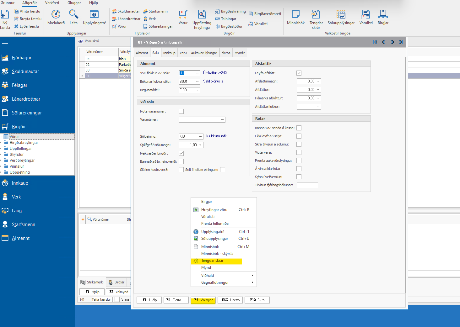 Smellt á Birgðir -> Vörur -> Vara valin -> F5 valmynd