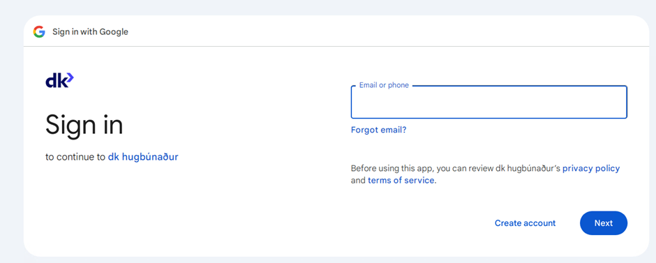 Auðkenningarleið: Hægt er að nota auðkenningu G-mail.