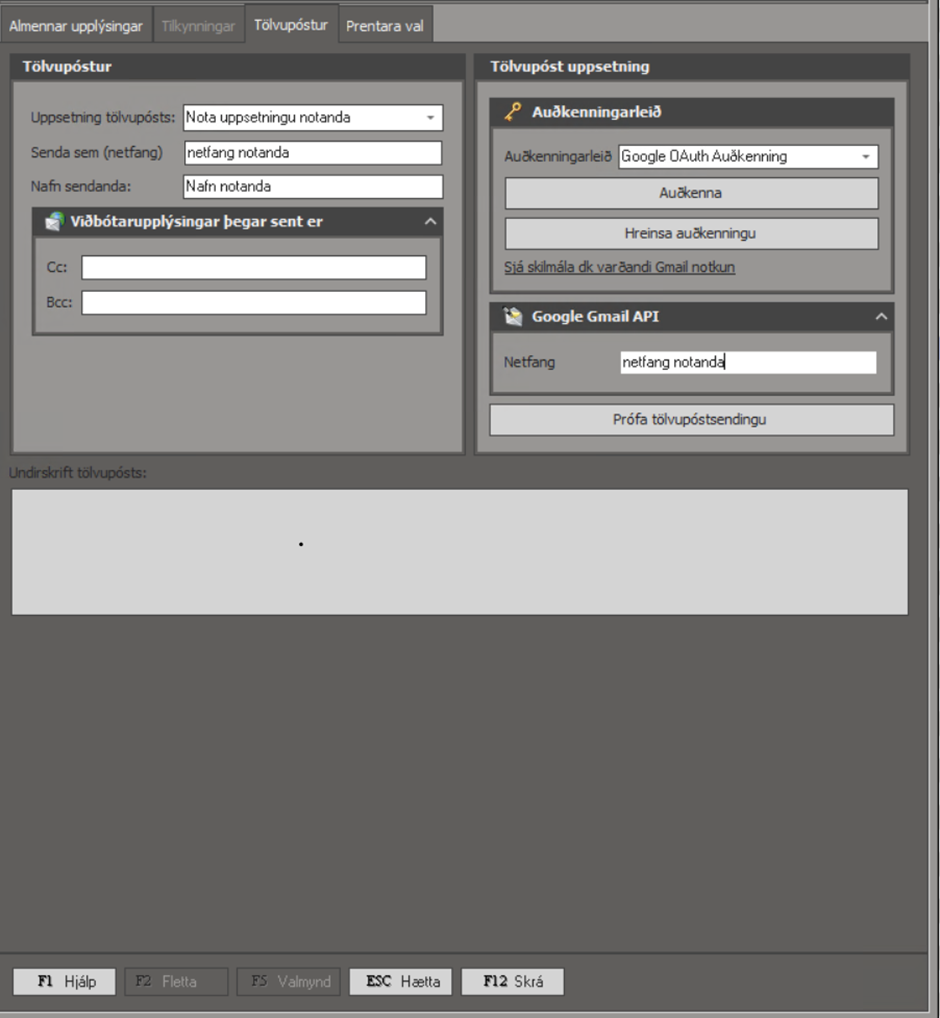 Smellir á tannhjólin sem eru uppi í hægra horninu í dk og ferð í flipan "Tölvupóstur" Hér fyrir neðan eru 2 leiðir til að auðkenna tölvupóstfang annasvegar Microsoft Office365 og hinsvegar G-mail Tenging við Microsoft Office365 Senda sem (netfang): ...