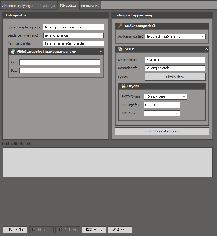 Smellir á tannhjólin uppi í hægra horninu í dk og ferð í fliptan "Tölvupóstur" Uppsetning tölvupósts: Nota fyrirtækja uppsetningu Senda sem (netfang): netfang notanda (Tölvupóstfang) Nafn sendanda: Fyrirtækjanafn eða nafn notanda Auðkenningarleið: ...
