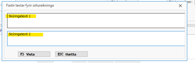 Þar er valið hvort að texti á að fara í Skýringatexta 1 eða 2. Það er einnig hægt að setja texta í bæði textahólfin. Skýringatexti 1 birtist efst á reikning en skýringartexti 2 neðst. Sömu aðferð er beitt ef breyta þarft skýringatexta.