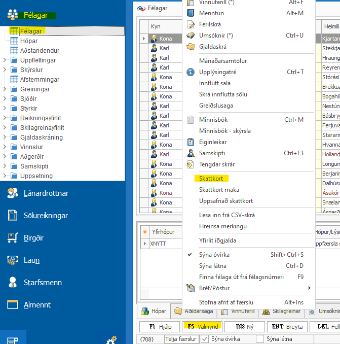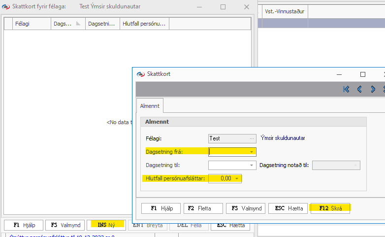 Skattkort maka Félagar > Félagar > Tvísmellir á launþegann > F5 Valmynd > Skattkort INS Ný > Setur inn dagsetning frá og hlutfall persónuafsláttar > F12 skrá