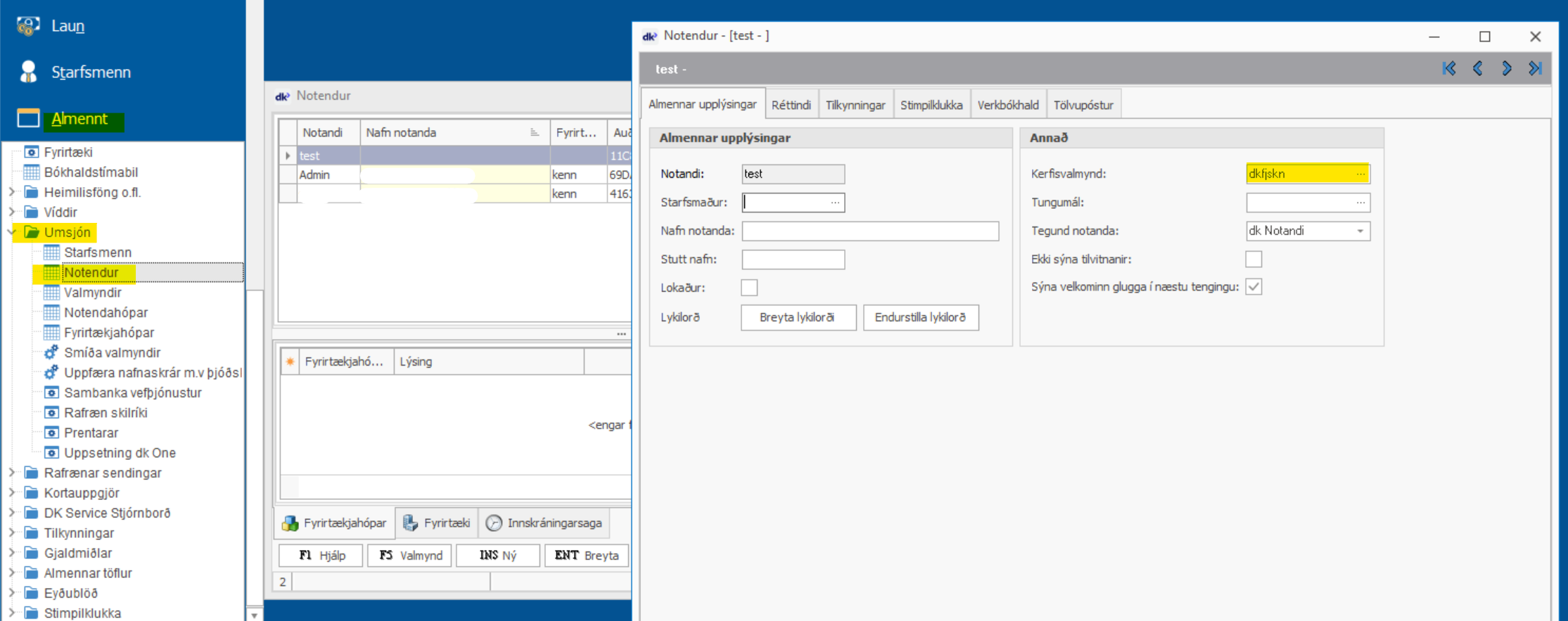Næst er farið í Almennt > Umsjón > Notendur > Tvísmellir á notendann sem á að festa valmyndina á > Setur inn valmyndina undir Kerfisvalmynd > F12 Skrá.