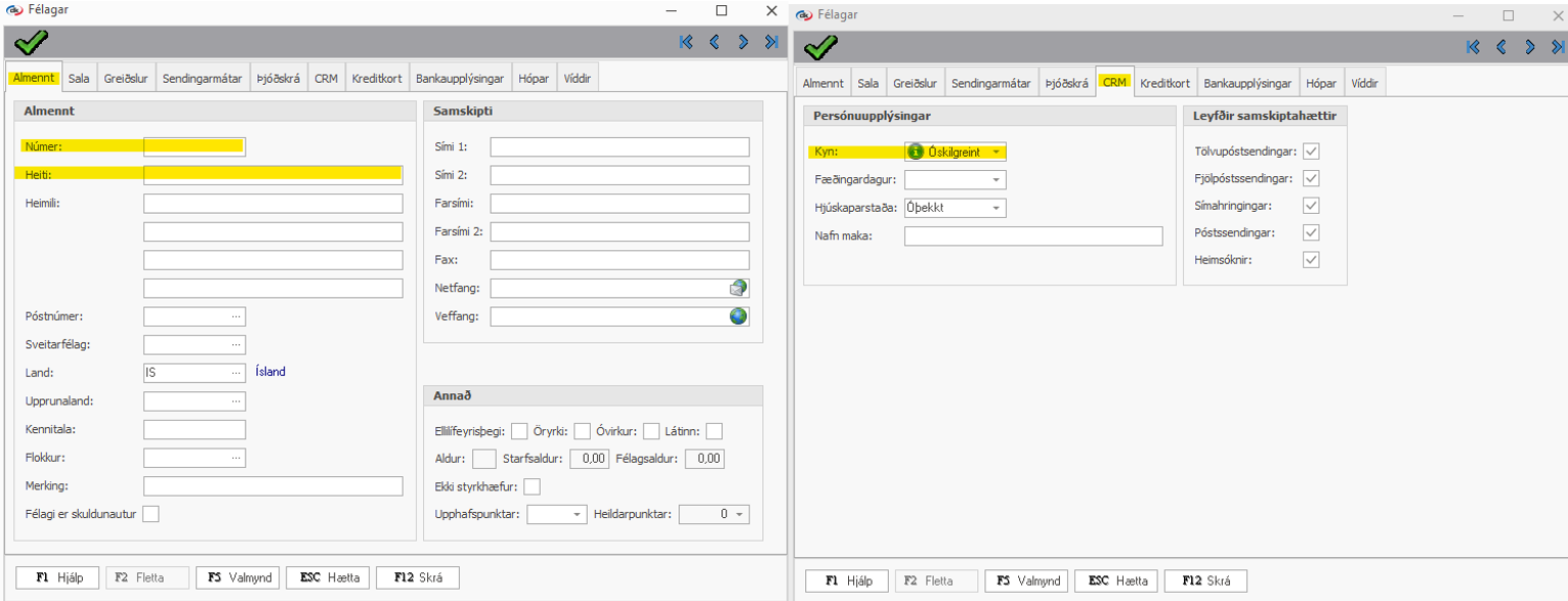 Nauðsynlegt er að skrá inn Númer og Heiti og velja rétt kyn inn á CRM flipanum.