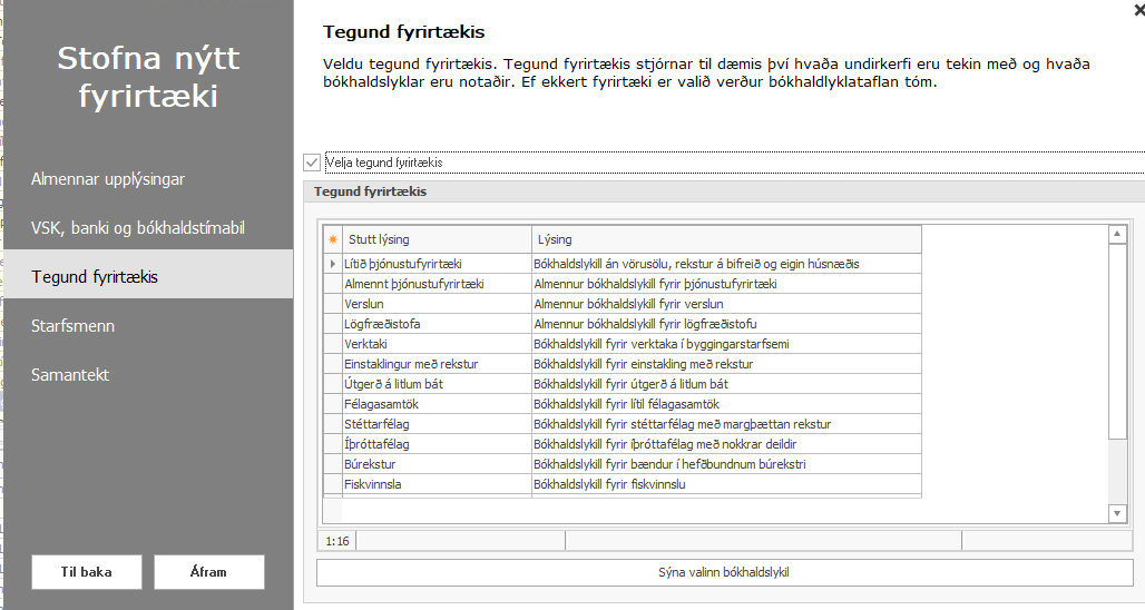 Hér er valið tegund fyrirtækis. Athugið að ef ekkert fyrirtæki er valið þá verður bókhaldslyklataflan tóm.