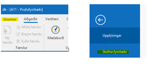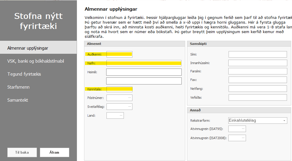Að stofna fyrirtæki er gert undir Grunnur > Stofna fyrirtæki