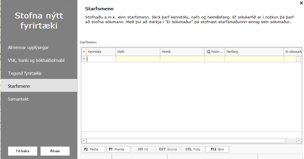 Hér er stofnað a.m.k. einn starfsmann. Skrá þarf kennitölu, nafn og heimilsfang.