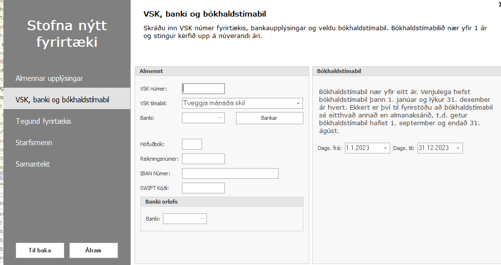 Hér er sett inn VSK númer, bankaupplýsingar og bókhaldstímabil.