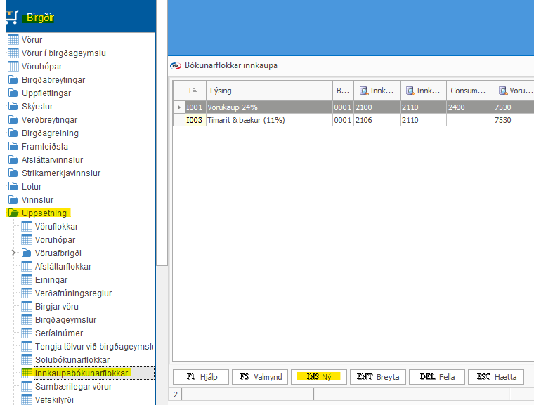 Birgðir > Uppsetning > Innkaupabókunarflokkar > INS Ný