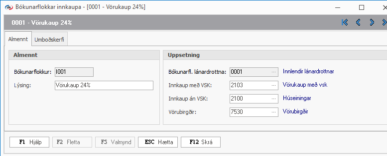 Hér er sett inn númer innkaupabókunarflokksins og lýsingu ásamt því að skilgreina bókunarflokk