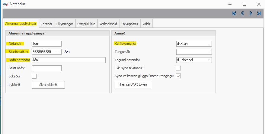 Í fyrsta flipanum "Almennar upplýsingar" eru settar inn almennar upplýsingar notanda.