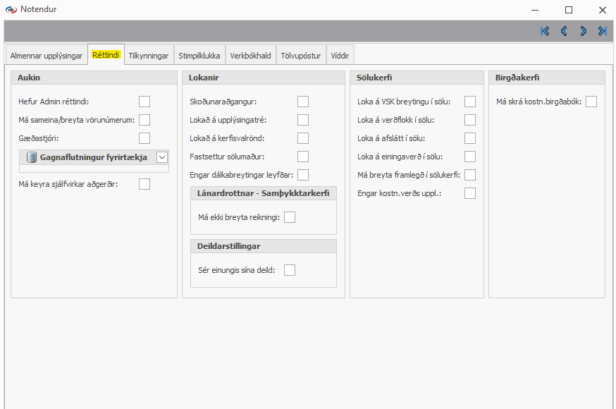 Í flipanum Réttindi er hakað við það sem notandinn má, eða má ekki, gera.