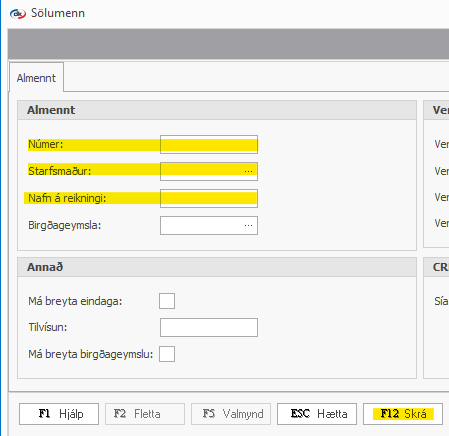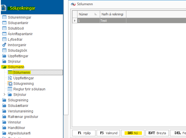 Til að stofna sölumenn er farið í Sölureikningar > Sölumenn > Sölumenn > INS Ný