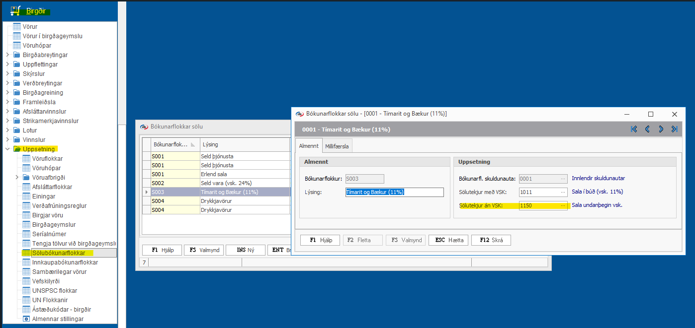Birgðir > Uppsetning > Sölubókunarflokkar > Opnar bókunarflokka sem eru í villunni > Breyta bókhaldslyklinum sem valinn er fyrir "sölutekjur án vsk".