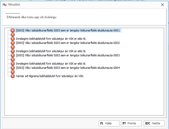 Sölubókunarflokkur - Villa Ef þið fáið sambærilega villu þegar er verið að bóka reikninga eða söludagbók þá þarf að stofna nýjan sölubókunarflokk og tengja við bókunarfl. skuldunauta. Birgðir > Uppsetning > Sölubókunarflokkar > Hefur flokkinn valinn ...