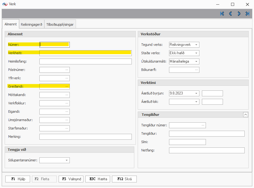 Nauðsynlegt er að skrá inn Númer, Verkheiti og Greiðanda (skuldunaut). Aðrar