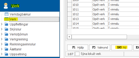 Að stofna verk er gert undir Verk > Verk > INS Ný