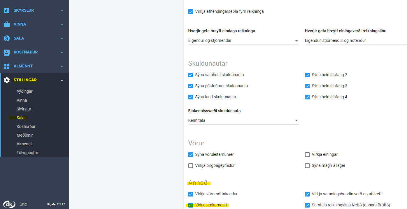 Stillingar > Sala > Haka í "Virkja strikamerki"