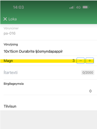Magn kemur default 1, en hægt er að breyta því eftir á með því að vista fyrst, smella síðan á vöruna undir kostnaður.
