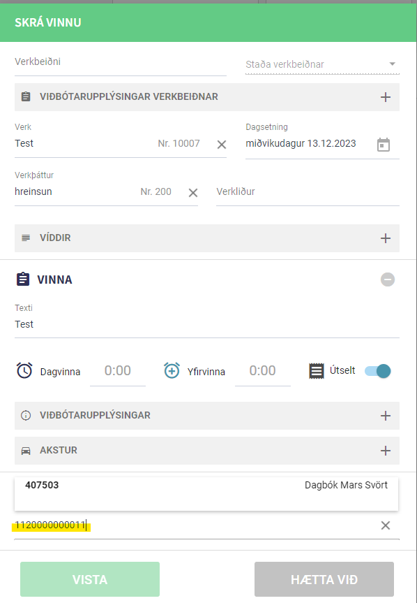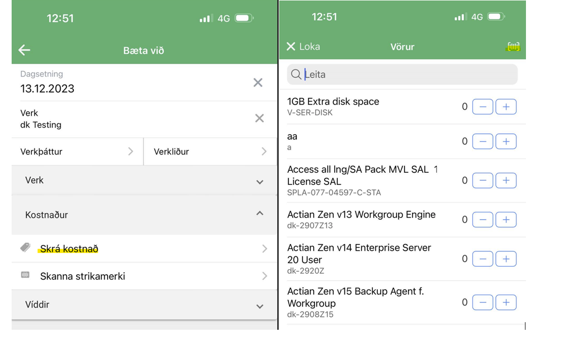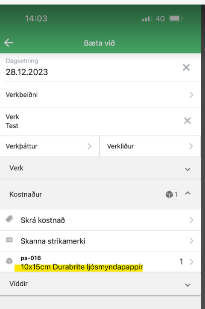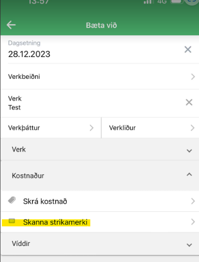 Þegar er skráð kostnað á verk þá er valið "Skrá kostnað" og síðan smellt á strikamerki efst á hægra horninu og þá er hægt að skanna inn.