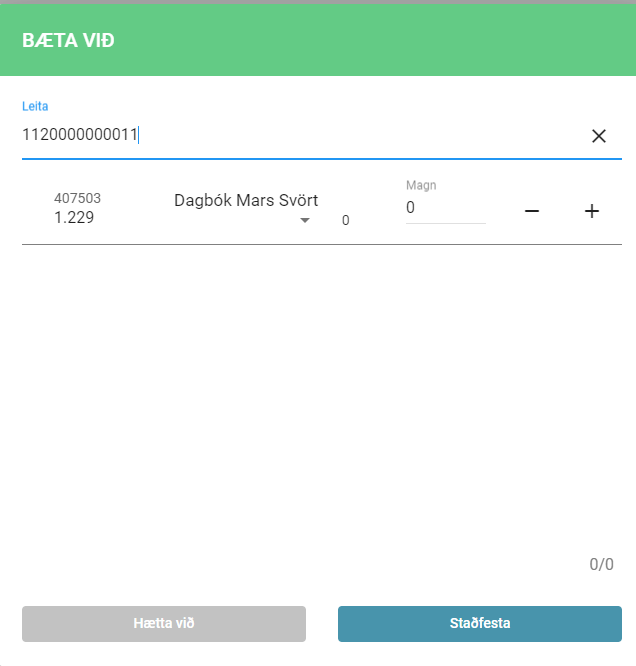 Byrjar síðan að skanna vörurnar. Þegar það er einhver vara komin inn þá er hægt að vista og þá kemur lína í skráninguna.