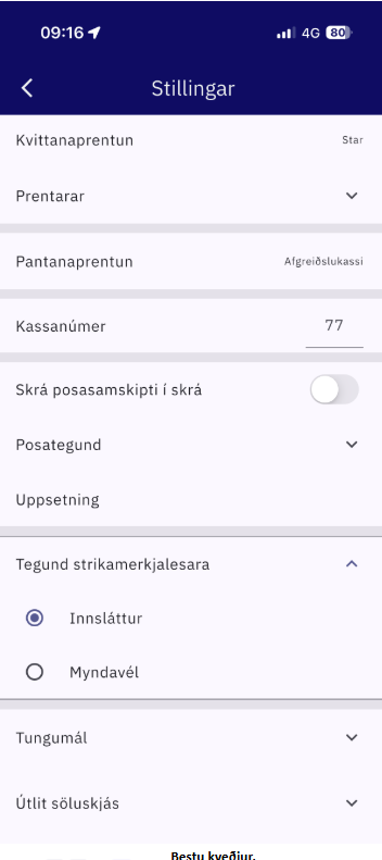 Undir stillingar og tegund strikamerkjalesara í appi.