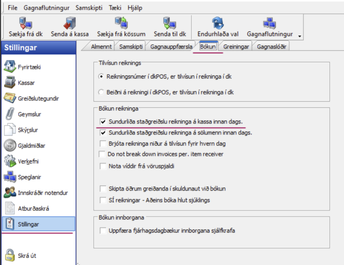 Ef að beiðnir/tilvísanir á reikningi í dkPos eiga að skila sér inn sem tilvísun á reikninga í dk. Þá er það stillt í bakvinnslunni undir: Stillingar → Stillingar → Bókun (flipi 3) → Haka í ,,Beiðni á reikningi í dkPos, er tilvísun í reikninga í dk." ...