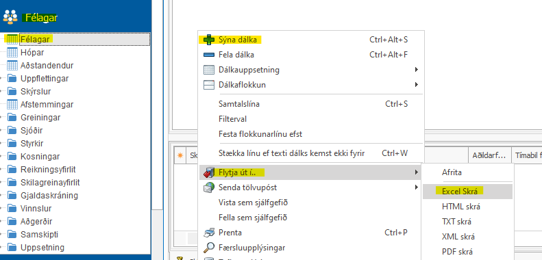 getur þú alltaf tekið út með því að fara inn í Félagar > Félagar. Þar getur þú bætt við dálkum að vild með því að hægri smella á gluggann og velja "Sýna dálka". Síðan er hægt að flytja út í excel skrá.