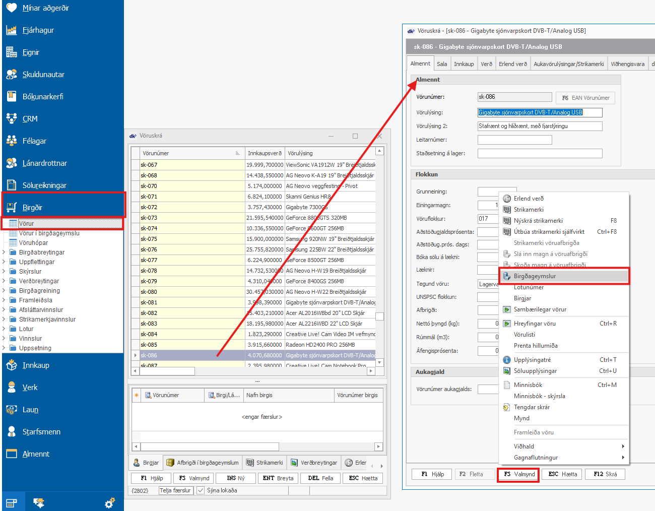 Farið er í Birgðir - Vörur og varan opnuð. Farið er í F5 Valmynd á vöruspjaldinu og ýtt er á Birgðageymslur.