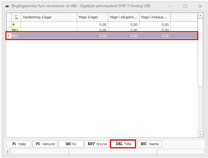 Þar opnast gluggi sem sýnir í hvaða birgðageymslum varan er, þú velur þá birgðageymslu sem á að taka vöruna úr og ýtir á DEL Fella.