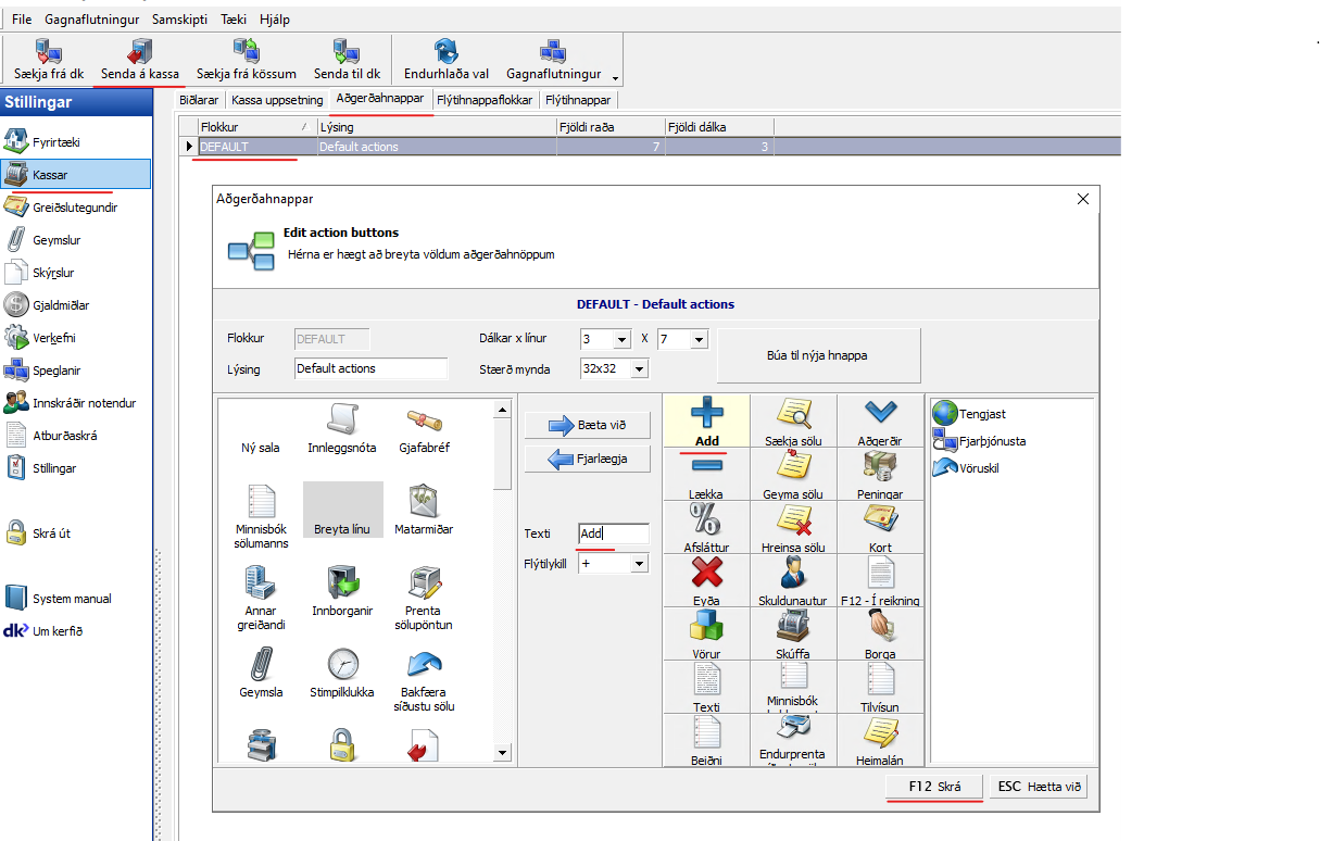 Til þess að bæta inn aðgerðarhnöppum á kassa þá þarf að opna bakvinnsluna / bakendann: Stillingar - Kassar - Aðgerðarhnappar (3 flipi) - Tvísmella á viðkomandi línu (kassa uppsetningarlínu) Draga svo viðeigandi hnapp sem á að bæta við yfir á aðal ...