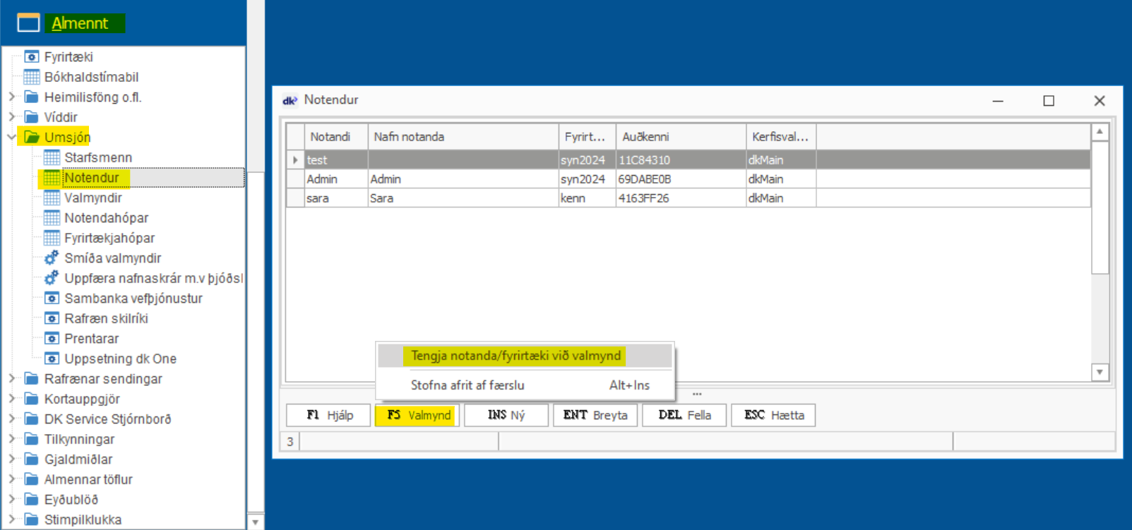 Þetta er hægt að gera með því að fara undir Almennt > Umsjón > Notendur > F5 Valmynd > Tengja notanda/fyrirtæki við valmynd.