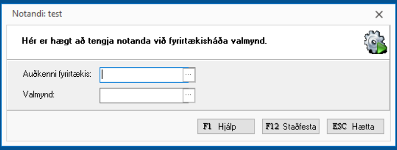 Þar setur þú inn auðkenni fyrirtækis sem á að nota takmörkuðu valmyndina og velur takmörkuðu valmyndina og staðfestir með F12.