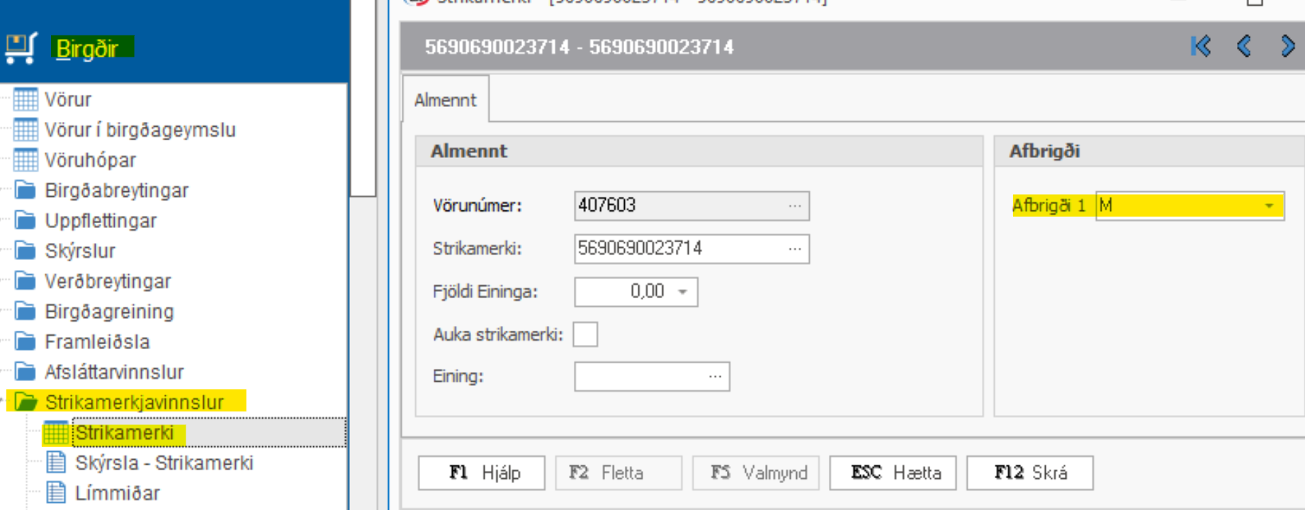 Birgðir > Strikamerkjavinnslur > Strikamerki > Tví smellir á vöruna/strikamerki > Setur inn afbrigði > F12 Skrá
