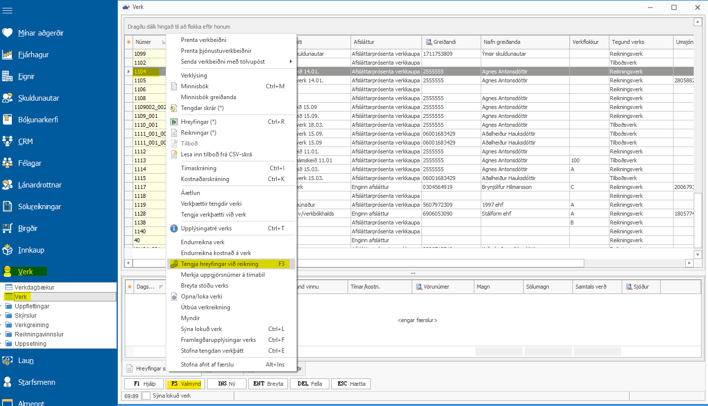 Verk - endurreikna hreyfingar Ef búið er að setja hreyfingar á verk og vörunúmer síðan uppfært þá er hægt að endurreikna hreyfingar á verki með því að fara undir Verk > Uppflettingar > Verk > * fyrir öll verk eða einstaka verk > CTRL+A fyrir allar ...