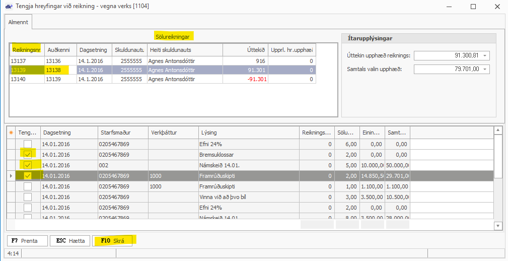 Velur svo hvaða reikning á að tengja við, ásamt því hvaða hreyfingar á tilteknu verki eiga a tengjast reikningnum > F10 til að skrá.