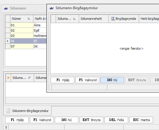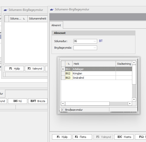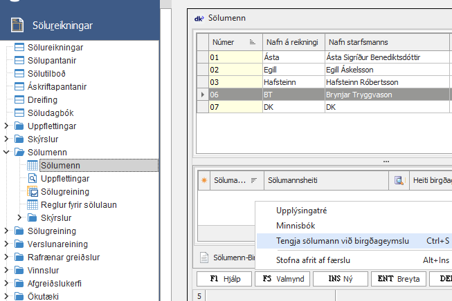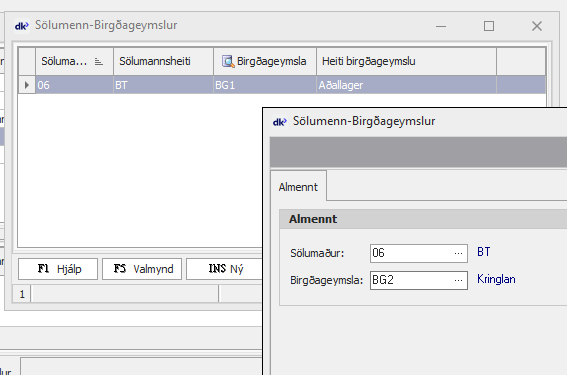 - F5 valmynd á viðkomandi sölumann sem á að tengja við birgðageymslurnar: