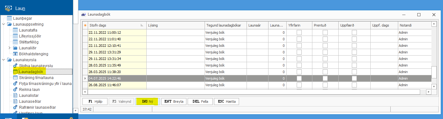 Nú er komið inn í launadagbók og ný dagbók stofnuð með Insert [INS ný].